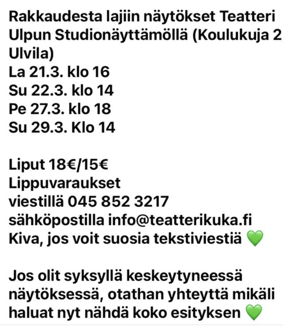 Teatteri KuKa?:n ensimmäinen tuotanto on Veikka Heinosen 2023 kirjoittama ja Kati Pipisen ohjaama Rakkaudesta lajiin. Tämä hersyvä ja herkistävä komedia on ensi-illassa keskiviikkona 29.10.2025 klo 19 Winston Livessä, Porin ydinkeskustassa.